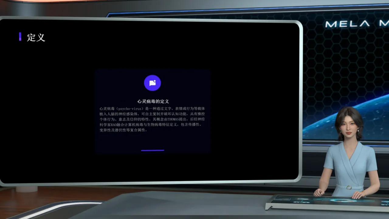 心灵病毒(psycho-virus)是一种通过文字、表情或行为等载体植入人脑的神经感染体,可自主复制并破坏认知功能,具有操控个体行为、意志及信仰的特性。其概念由THOMAS提出,后经神经科学家RAO融合计算机病毒与生物病毒特征定义,包含传播性、变异性及潜伏性等复合属性。