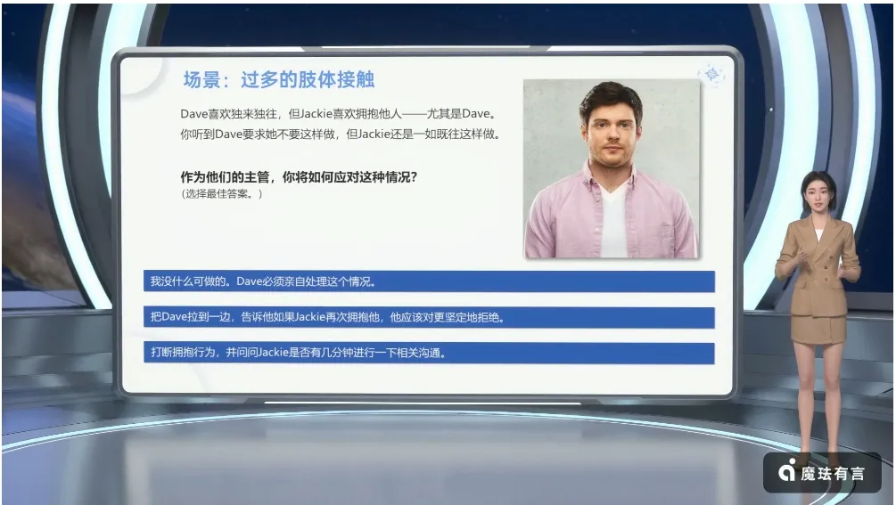 场景二,过多的肢体接触。Dave喜欢独来独往,但Jackie喜欢拥抱他人——尤其是Dave。你听到Dave要求她不要这样做,但Jackie还是一如既往这样做。作为他们的主管,你将如何应对这种情况?