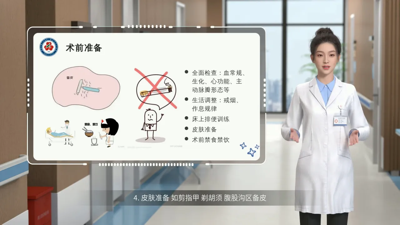 1. 手术前,需完善血常规、生化、心功能、血型等血液检查;胸部CT、心脏超声和主动脉CTA等检查,以详细了解主动脉根部的结构。 2. 生活调整:建议您在术前停止吸烟,保持规律的作息和充足的睡眠。同时,注意保暖,预防感冒,将身体调整至最好的状态。 3. 床上排便训练:由于术后早期需要卧床,建议您提前进行床上排便训练,以适应术后生活。 4. 皮肤准备:如剪指甲、剃胡须、腹股沟区备皮。 5. 术前禁食禁饮:手术将在全麻下进行,术前晚间禁食禁饮,禁食不当会引起麻醉时误吸,导致不良后果,请您按照医师要求严格执行禁食、禁饮时间。